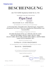 Das Prüfprogramm umfasst das Prüfen von metallischen, geschweißten Druckbehältern, Rohrleitungen und Anlagen sowie Druckbehältern, Rohrleitungen und Anlagen aus HDPE und PP mit verschiedenen Prüfmedien.